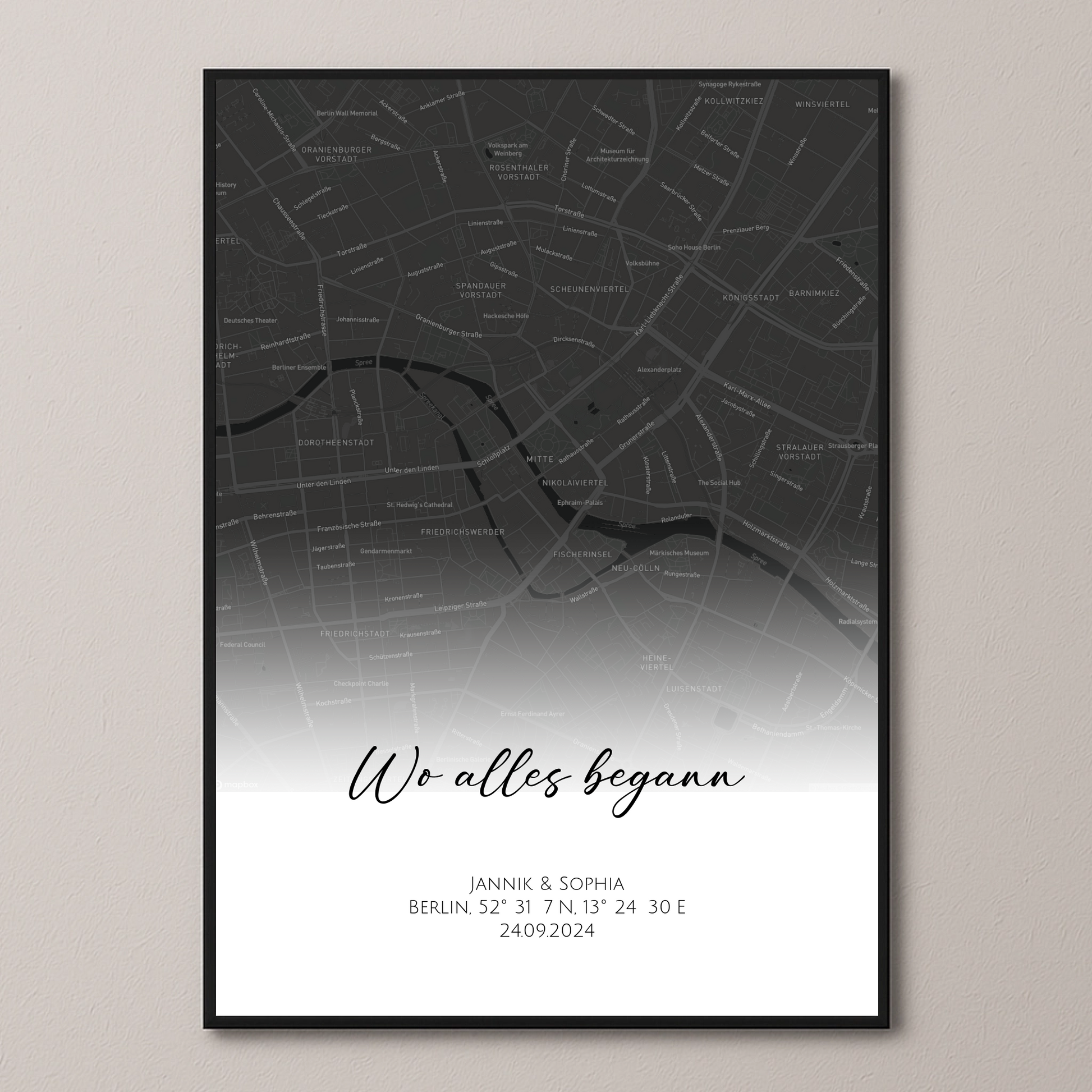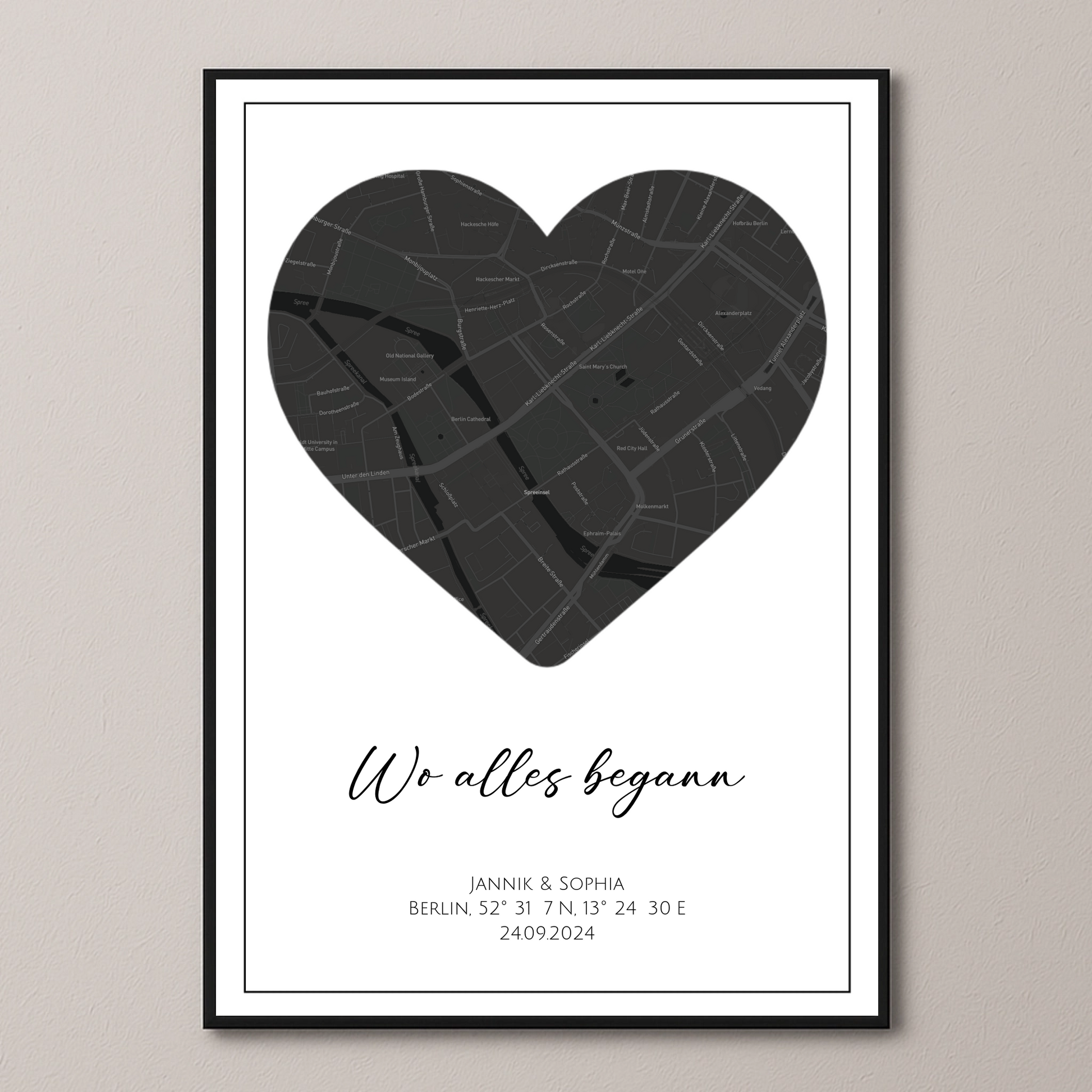 Gestalte jetzt dein maßgeschneidertes Poster mit Standort, Namen und Datum und kreiere ein persönliches Kunstwerk, das für immer an euer ganz besonderes Kapitel erinnert. ✨